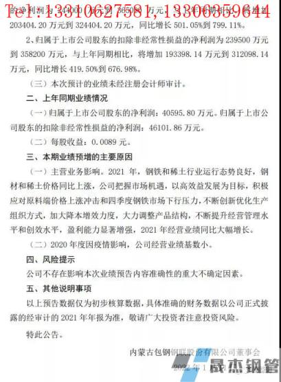 1月11日晚,鋼鐵板塊的牛股包鋼股份公布業績預告,預計2021年度實現歸屬于上市公司股東的凈利潤為24.4億元到36.5億元,與上年同期相比,將增加20.34億元到32.44億元,同比增長501.05%到799.11%;歸屬于上市公司股東的扣除非經常性損益的凈利潤為23.95億元到35.82億元,與上年同期相比,將增加19.34億元到31.21億元,同比增長419.50%到676.98%。