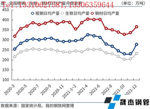 12月份,全國粗鋼日均產量278.04萬噸,環比大增20.3%,超過市場預期。一方面,由于11月份鐵礦石、焦炭等原燃料價格大幅下跌,12月份無縫鋼管廠家生產成本明顯下降,效益好轉推升擴產意愿。另一方面,2021年全國粗鋼產量壓減工作提前完成,為此12月份各地無縫鋼管廠家普遍出現復產。