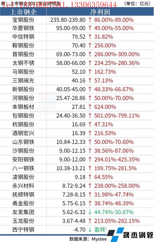 免責聲明:本網站(山東聊城晟杰無縫鋼管廠www.www-86604.com)刊載的“24家上市鋼企業績飄紅,9家實現凈利潤翻倍增長”等均源于網絡,版權歸原作者所有,且僅代表原作者觀點,本文所載信息僅供參考。轉載僅為學習與交流之目的,如無意中侵犯您的合法權益,請及時聯系刪除。本網站刊登此篇文章并不意味著本站贊同其觀點或證實其內容的真實性,我們不對其科學性、嚴肅性等作任何形式的保證。如果侵犯了您的版權,請盡快聯系我們予以撤銷,謝謝合作!