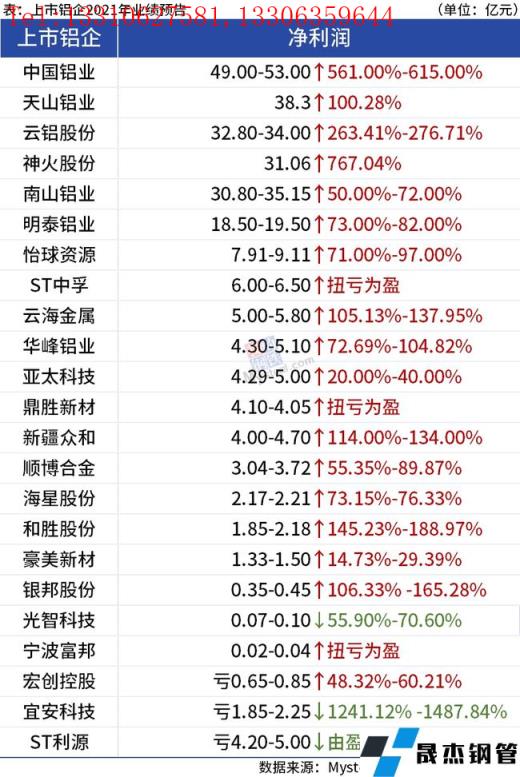 免責聲明:本網站(山東聊城晟杰無縫鋼管廠www.www-86604.com)刊載的“23家上市鋁企披露2021年業績預報,超8成凈利潤增長”等均源于網絡,版權歸原作者所有,且僅代表原作者觀點,本文所載信息僅供參考。轉載僅為學習與交流之目的,如無意中侵犯您的合法權益,請及時聯系刪除。本網站刊登此篇文章并不意味著本站贊同其觀點或證實其內容的真實性,我們不對其科學性、嚴肅性等作任何形式的保證。如果侵犯了您的版權,請盡快聯系我們予以撤銷,謝謝合作!