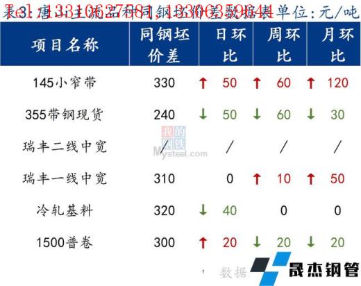 145帶鋼與鋼坯價差拉大,小窄帶漲幅高于鋼坯上漲速度,調(diào)坯軋材廠仍在停產(chǎn)。焊管與355帶鋼價差較昨日持平,熱卷與帶鋼價差擴大,卷帶差修復。