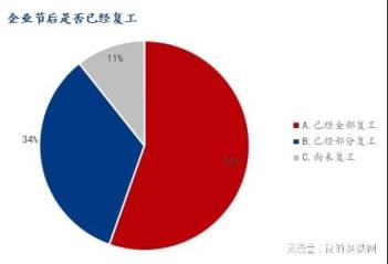 調(diào)研企業(yè)樣本中,已經(jīng)全部復(fù)工占比55.43%,已經(jīng)部分復(fù)工占比33.92%,尚未復(fù)工占比10.64%。企業(yè)復(fù)工復(fù)產(chǎn)節(jié)奏較快。
