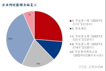 調(diào)研企業(yè)樣本中,對于全面復(fù)工的時(shí)間,節(jié)后第一周(2022年2月7日~2月13日)占比26.37%,節(jié)后第二周(2022年2月14日~2月20日)占比36.32%,節(jié)后第三周(2022年2月21日~2月27日)占比19.40%,節(jié)后第四周或以后(2022年2月28日及以后)占比6.47%,暫未確定占比11.44%。