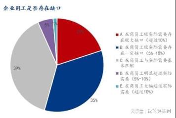 3、對比實(shí)際經(jīng)營需要,54.32%企業(yè)表示在崗員工比實(shí)際需要存在缺口,39.02%企業(yè)表示在崗員工與實(shí)際需要基本匹配,僅有6.65%在崗員工超過實(shí)際需要。