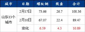 本周省內建筑厚壁無縫鋼管市場社會庫存大幅增加。截至2月17日,據(jù)我網(wǎng)調研山東省主流市場包括青島、臨沂、濟南三大市場的樣本倉庫建筑厚壁無縫鋼管社會庫存總量為56.36萬噸,較上一周同期增加9.58萬噸,增幅17%。具體情況如圖1所示。