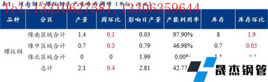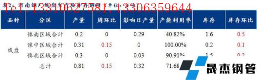 1、調(diào)研數(shù)據(jù)顯示,統(tǒng)計(jì)的河南地區(qū)10家建筑厚壁無縫鋼管樣本無縫厚壁鋼管廠家中,河南省無縫厚壁鋼管廠家線盤日均產(chǎn)量0.81萬噸,較上周小幅增加0.15萬噸;檢修/限產(chǎn)影響建材日產(chǎn)量為0.32萬噸,產(chǎn)能利用率71.68%,較上周上升13.27%。