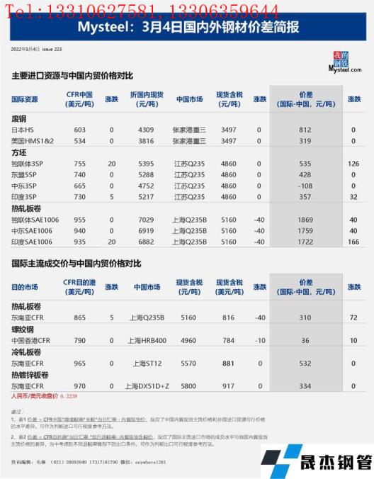 免責聲明:本網站(山東聊城晟杰無縫鋼管廠www.www-86604.com)刊載的“2022年03月04日日報:國內外鋼材_無縫鋼管價差匯總(2022.3.4)”等均源于網絡,版權歸原作者所有,且僅代表原作者觀點,本文所載信息僅供參考。轉載僅為學習與交流之目的,如無意中侵犯您的合法權益,請及時聯系刪除。本網站刊登此篇文章并不意味著本站贊同其觀點或證實其內容的真實性,我們不對其科學性、嚴肅性等作任何形式的保證。如果侵犯了您的版權,請盡快聯系我們予以撤銷,謝謝合作!