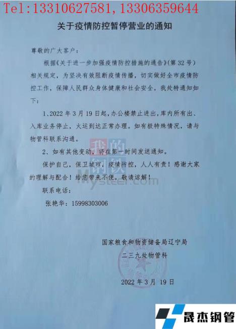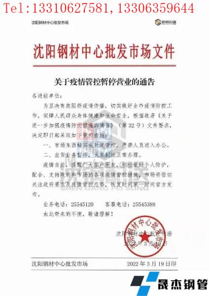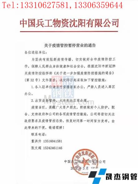 目前沈陽厚壁無縫鋼管中心批發(fā)市場已發(fā)布通告,19日起北一西路東西樓試試封閉管控、嚴(yán)禁人員進入辦公,出庫業(yè)務(wù)暫停、火車到達正常辦理;中國兵工物資125庫通告19日起嚴(yán)禁人員進入庫區(qū)辦公,出庫業(yè)務(wù)暫停、火車到達正常辦理;國家糧食和物資儲備局遼寧局二三九處通告19日起辦公樓嚴(yán)禁進出,庫內(nèi)所有出入庫業(yè)務(wù)暫停、火運到達正常辦理。市內(nèi)其他主要厚壁無縫鋼管市場反饋暫時正常辦公及出庫,但從防控指揮部通告內(nèi)容來看、也有暫停營業(yè)的傾向。(通告見文末圖片)