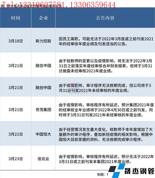 與往年相比,今年房企披露業(yè)績呈扎堆發(fā)布的特點,多集中在3月29日-31日。除此之外,截至3月24日,據不完全統(tǒng)計,已有6家重點房企發(fā)布公告稱將延遲刊發(fā)2021年度業(yè)績報告,公告顯示延遲原因多為疫情影響,具體情況如下: