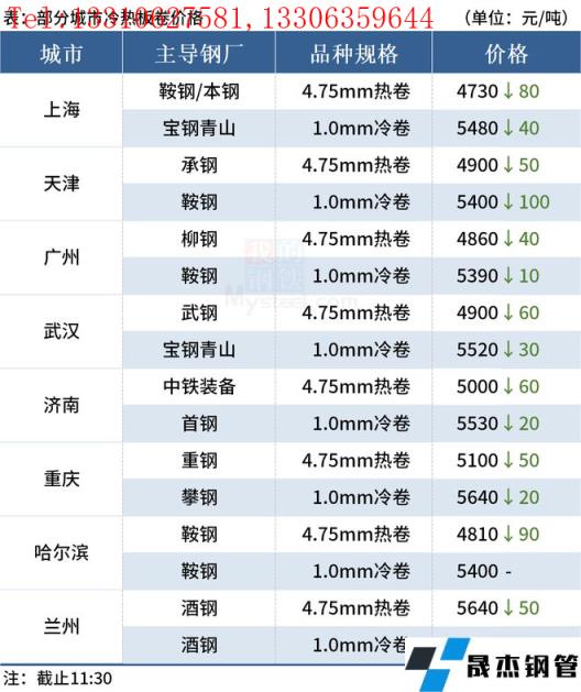 ◎上海:10日早盤熱卷市場價格跌80,現主流報價1500普4710-4730元/噸,1800普4830-4840元/噸;1500錳4860元/噸,1800報4920元/噸左右,2.75Q235B報4840-4850元/噸,2.75SPHC報4910元/噸左右。(單位:元/噸)