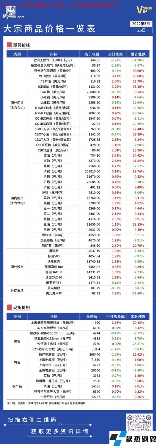 免責聲明:本網站(山東聊城晟杰無縫鋼管廠www.www-86604.com)刊載的“俄烏局勢丨大宗商品價格一覽表(5月26日)”等均源于網絡,版權歸原作者所有,且僅代表原作者觀點,本文所載信息僅供參考。轉載僅為學習與交流之目的,如無意中侵犯您的合法權益,請及時聯系刪除。本網站刊登此篇文章并不意味著本站贊同其觀點或證實其內容的真實性,我們不對其科學性、嚴肅性等作任何形式的保證。如果侵犯了您的版權,請盡快聯系我們予以撤銷,謝謝合作!