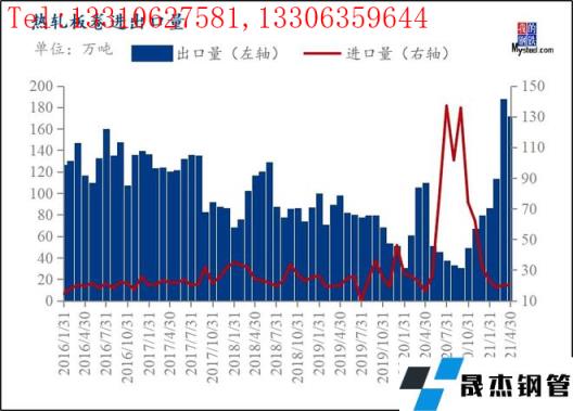 就目前來(lái)看,近期熱卷出口量暴增主要是因?yàn)?至4月份大批量出口單簽訂,并開(kāi)始陸續(xù)發(fā)貨,因此4-6月份出口量或?qū)⒗^續(xù)攀升,但從近期出口市場(chǎng)訂單簽訂情況來(lái)看,我國(guó)熱軋板卷出口或?qū)⒃?月份開(kāi)始減量。