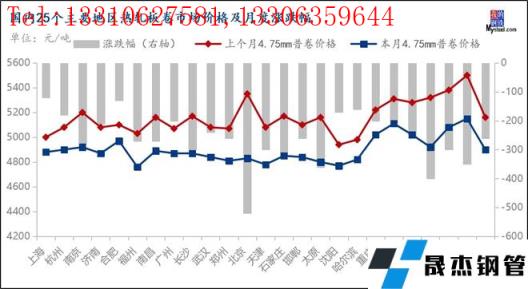 圖6:國(guó)內(nèi)25個(gè)主要地區(qū)熱軋板卷市場(chǎng)價(jià)格及月度漲跌幅