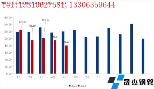 5月中國進口厚壁無縫鋼管80.6萬噸,較上月減少15萬噸,同比下降33.4%;1-5月累計進口厚壁無縫鋼管498.0萬噸,同比下降18.3%。