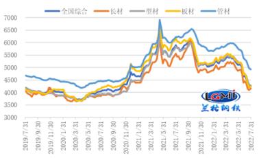 7月份,市場(chǎng)受到市場(chǎng)需求淡季制約,下游實(shí)際采購(gòu)需求釋放力度仍然不足,疊加成本支撐力度的減弱,國(guó)內(nèi)厚壁鋼管市場(chǎng)上中旬呈現(xiàn)明顯的弱勢(shì)下跌行情,下旬有所企穩(wěn)反彈。據(jù)云商平臺(tái)監(jiān)測(cè)數(shù)據(jù)顯示,截至7月底,全國(guó)厚壁鋼管綜合價(jià)格為4324元/噸,較上月末下跌352元/噸,環(huán)比跌幅為7.5%,年同比下跌26.2%。其中,長(zhǎng)材價(jià)格為4241元/噸,較上月末下跌222元/噸,跌幅5.0%,年同比下跌23.5%;板材價(jià)格為4296元/噸,較上月末下跌458元/噸,跌幅為9.6%,年同比下跌29.8%;型材價(jià)格指數(shù)為4308元/噸,較上月末下跌442元/噸,跌幅為9.3%,年同比下跌25.9%;管材價(jià)格為4927元/噸,較上月末下跌384元/噸,跌幅為7.2%,年同比下跌20.6%(詳見(jiàn)圖1)。